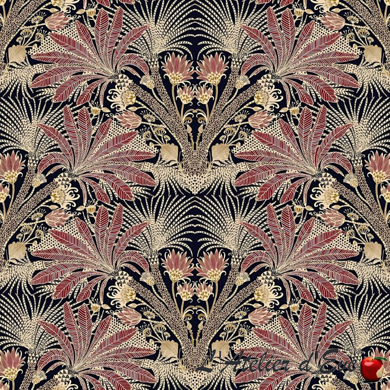 Burgundy and ecru palm tree designs on a black background